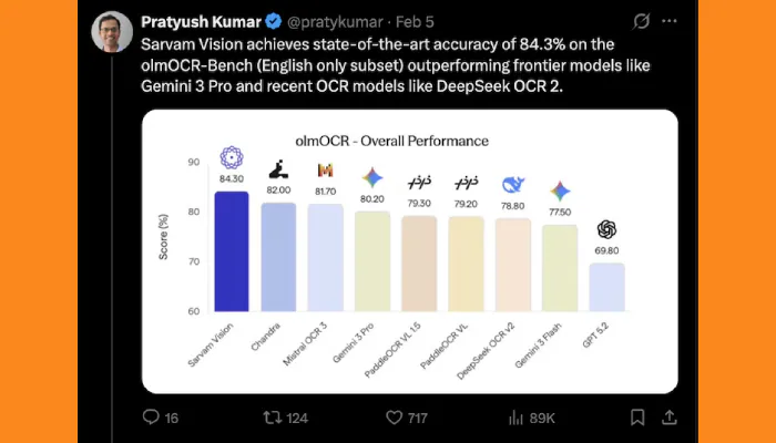 Sarvam AI co-founder Pratyush Kumar recently detailed the achievements of the company’s in-house AI models in several posts on X. According to the company, Sarvam Vision achieved an accuracy score of 84.3 percent on OmniOCR-Bench. This score is higher than Gemini 3 Pro and recent OCR models like DeepSeek OCR v2, while ChatGPT ranked significantly lower.